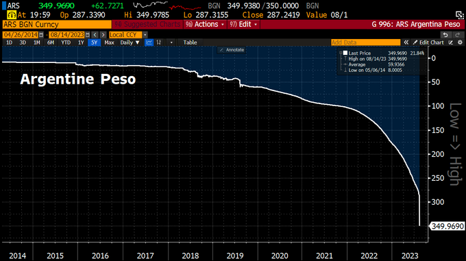 在本轮全球货币贬值浪潮中,一些国家因深陷债务和政治动荡而无力抵抗。阿根廷比索在周一大选初选结果揭晓后瞬间贬值18%,官方也被迫将汇率贬值。尽管阿根廷央行紧急加息,但几乎无法阻挡比索跌势。全球范围内的下一个“阿根廷”是否会出现,仍是一个未知数。