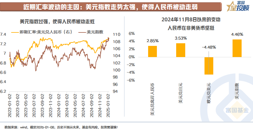 近期人民币汇率走弱,更多是受美元指数强势的影响。自2024年11月8日以来,美元指数上涨了4.46%,同期,美元兑离岸人民币上涨2.85%,美元兑日元上涨3.53%,而欧元兑美元则下跌了4.48%。在非美货币中,人民币的表现相对更为坚挺。