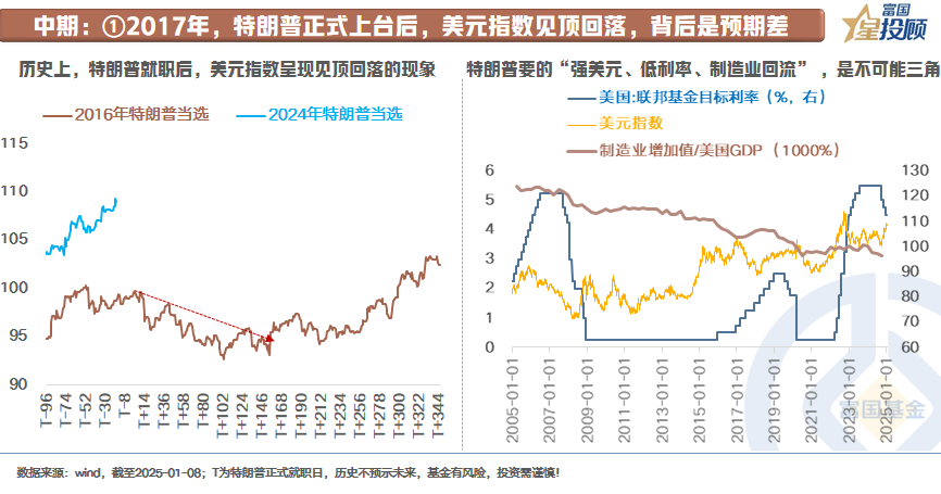 从历史经验来看,美元指数的走势往往受到市场预期的影响。近期美元指数的强势主要源于市场对特朗普上台后政策主张的提前反应。然而,市场持续交易时容易过度强化预期,导致现实往往不及预期。