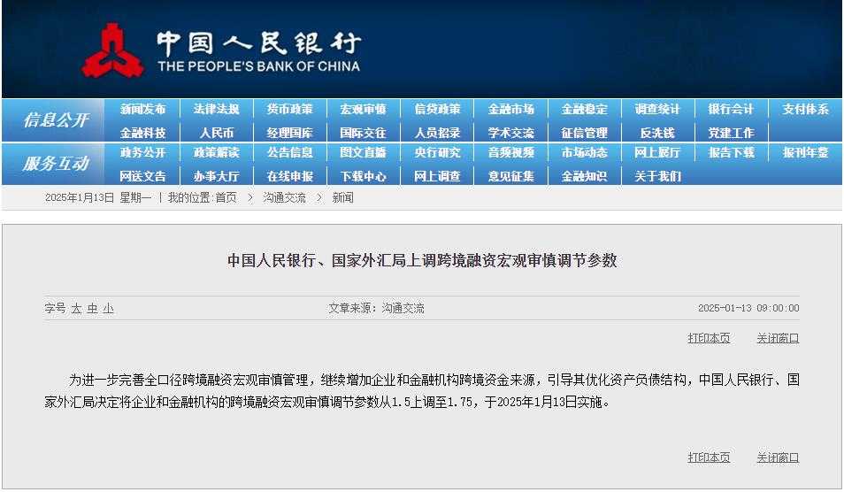 中国人民银行与国家外汇管理局决定将企业和金融机构的跨境融资宏观审慎调节参数上调至1.75,于2025年1月13日实施,旨在增加跨境资金来源,优化资产负债结构。
