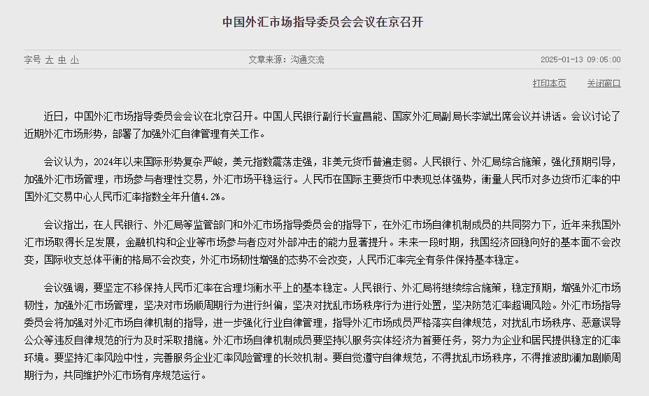 中国外汇市场指导委员会会议在京召开,会议强调加强外汇自律管理,指导外汇市场成员严格落实自律规范,为实体经济提供稳定汇率环境,共同维护外汇市场有序规范运行。