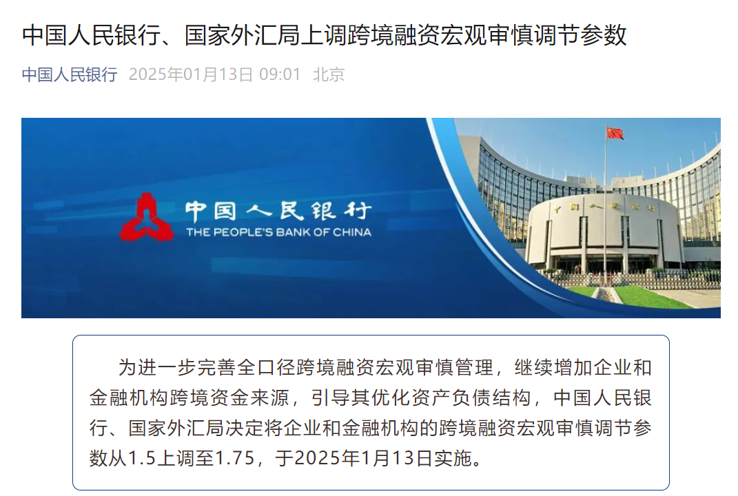 【导读】为进一步完善跨境融资管理,央行与外汇局联合行动,将跨境融资宏观审慎调节参数上调至1.75。