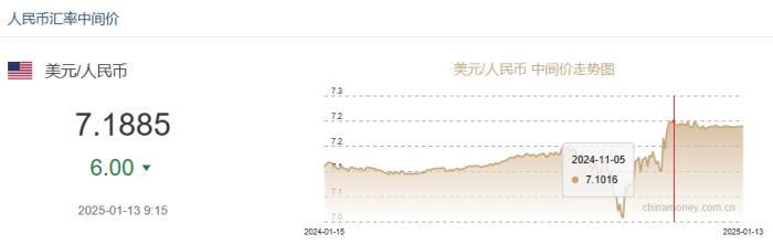 中国外汇交易中心公布,2025年1月13日银行间外汇市场人民币汇率中间价上调6个基点,1美元对人民币7.1885元,反映当前外汇市场动态调整。