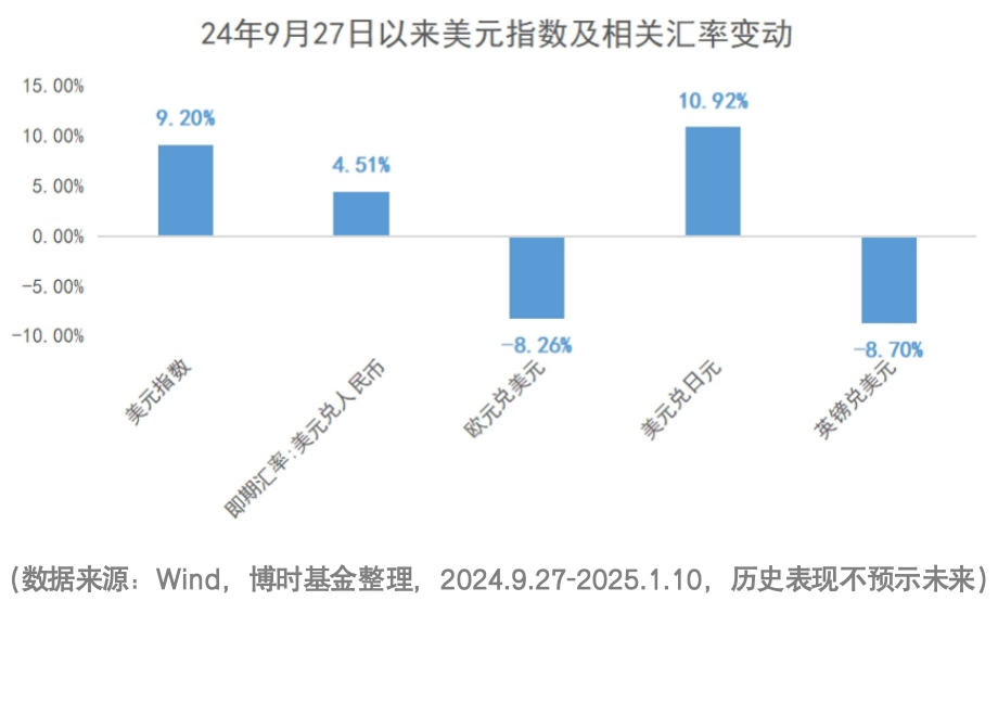 自2024年9月27日美元指数触达阶段性低点以来,截至2025年1月10日,其累计涨幅已达9.20%。同期,人民币贬值4.51%,约相当于美元升值幅度的一半。尽管如此,与欧元、日元、英镑等其他主要货币的贬值幅度相比,人民币汇率的表现仍相对坚挺。这一趋势在“811”汇改后更为明显,人民币的金融属性逐渐增强,美元兑人民币汇率的双向波动成为常态。