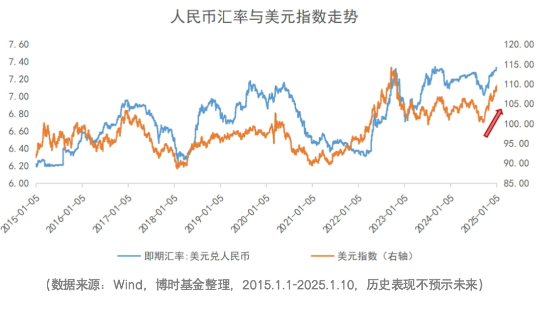 从中长期来看,人民币汇率的表现仍受到国内外两方面因素的影响。尽管当前海外因素相对不可控,但国内仍存在一定的政策空间来发力提振内需,从而提升人民币资产的回报率。例如,2024年中央经济工作会议中提出要实施更加积极有为的宏观政策和适度宽松的货币政策,这些政策有望在新一年逐步落地,进一步改善内需并巩固经济修复态势,从而有助于人民币汇率的相对稳定。