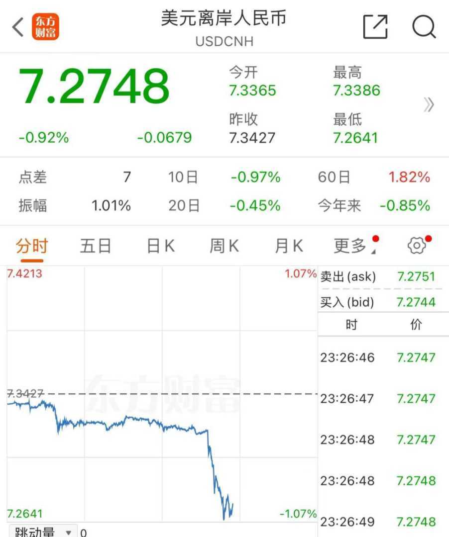 与此同时,离岸人民币兑美元汇率则呈现出强劲的反弹态势,连续突破了7.31、7.30、7.29、7.28、7.27等多个重要关口,日内涨幅超过700点。截至发稿,离岸人民币兑美元汇率报7.2748,这一涨幅显示出市场对人民币汇率的信心正在逐步恢复。
