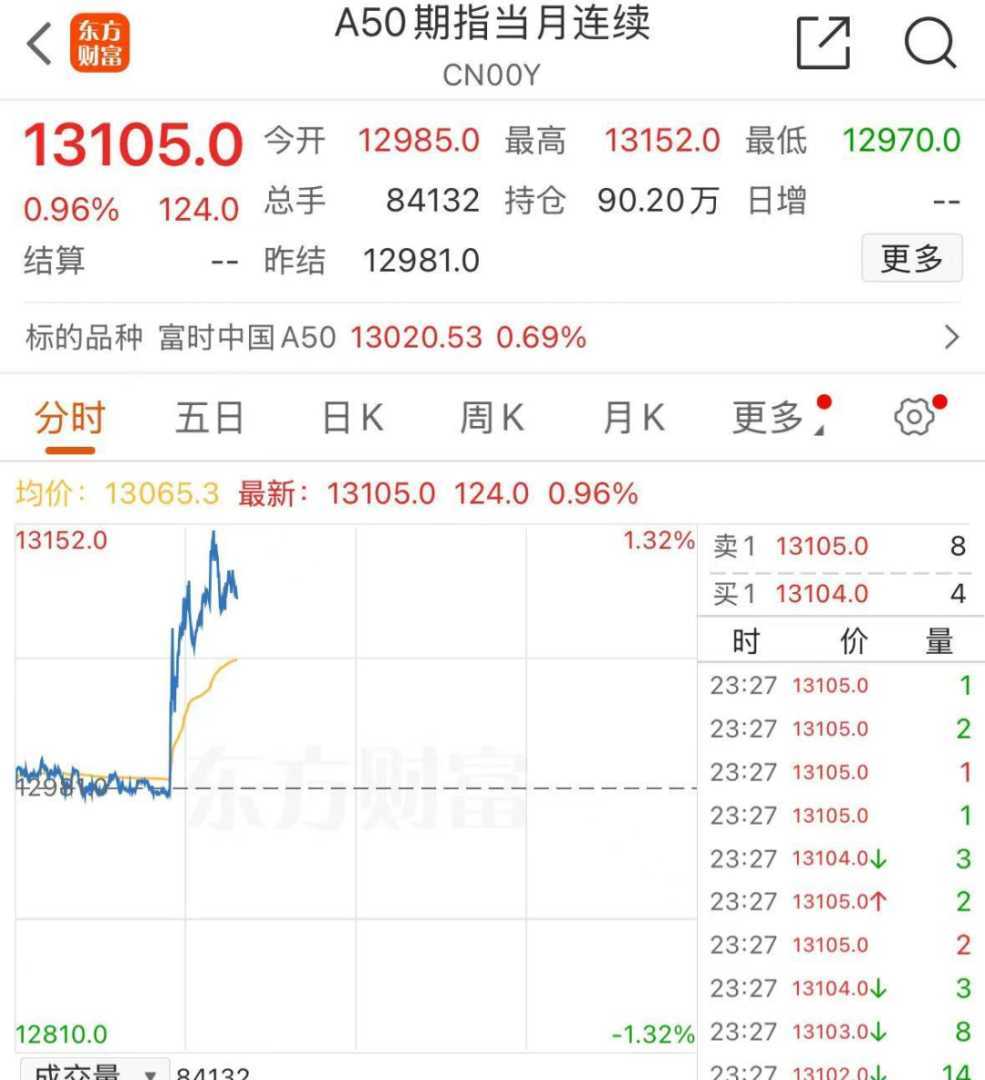 随着人民币汇率的企稳,中国资产也迎来了爆发式增长。周一晚间,A50指数直线拉升,展现出强劲的市场信心。截至发稿,A50期指当月连续成功涨破13000点,一度涨幅超过1.3%,虽然后续有所回落,但截至发稿时仍保持着0.96%的涨幅。