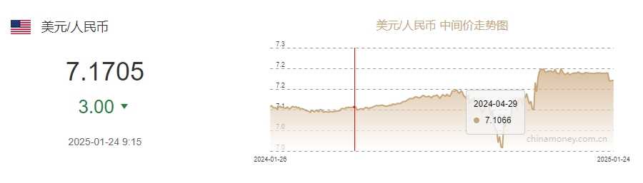 2025年1月24日,中国人民银行授权中国外汇交易中心公布银行间外汇市场人民币汇率中间价,1美元对人民币上调至7.1705元,上调3个基点,反映了外汇市场动态平衡及政策导向。