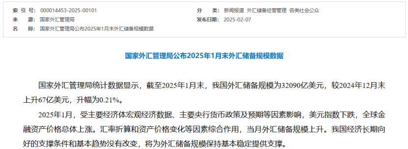 截至2025年1月末,我国外汇储备规模达到32090亿美元,连续第十四个月维持在3.2万亿美元以上。同时,中国央行已连续三个月增持黄金,显示出对黄金资产的持续青睐。文章分析了外汇储备规模上升的原因及未来趋势。