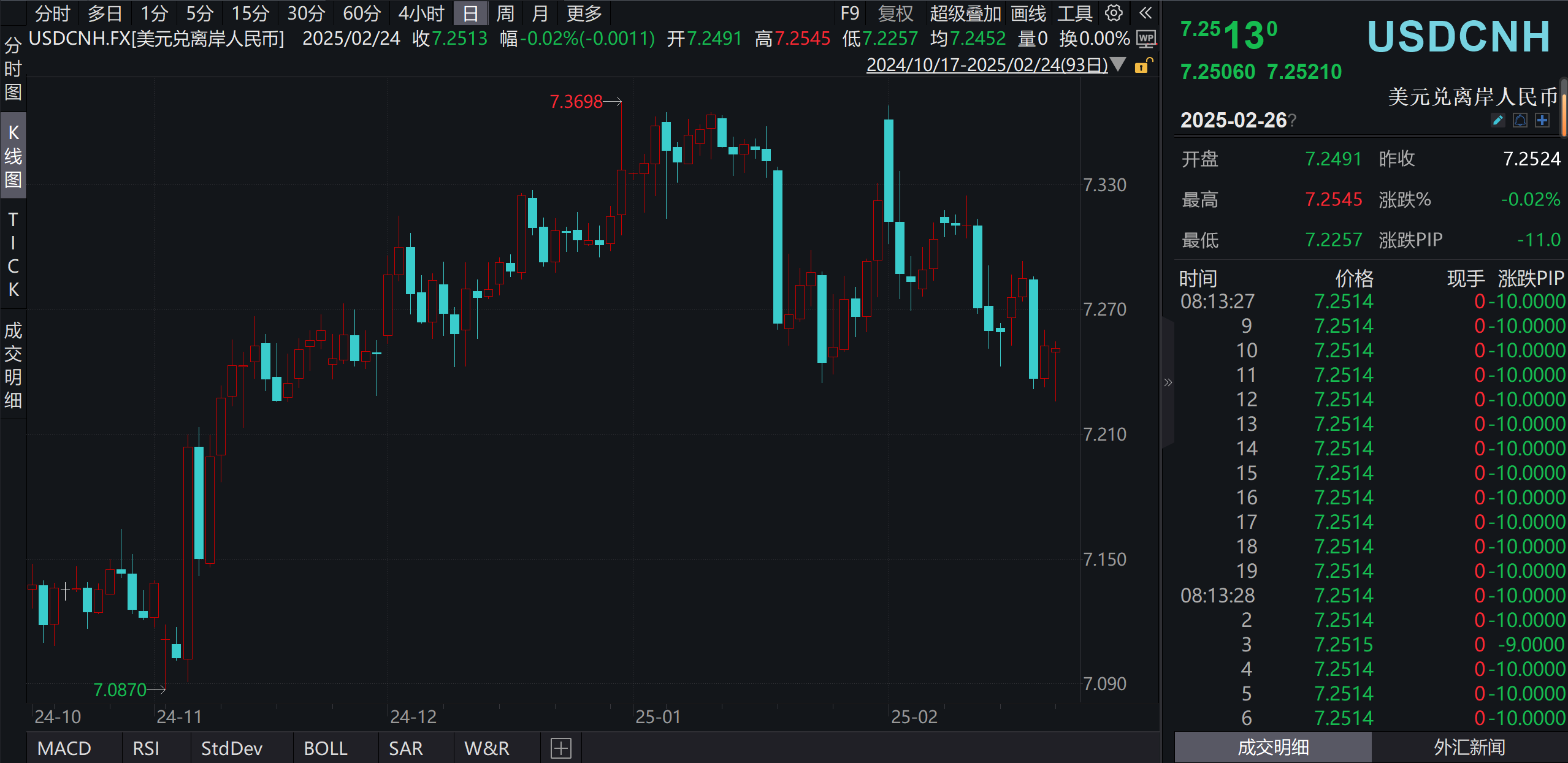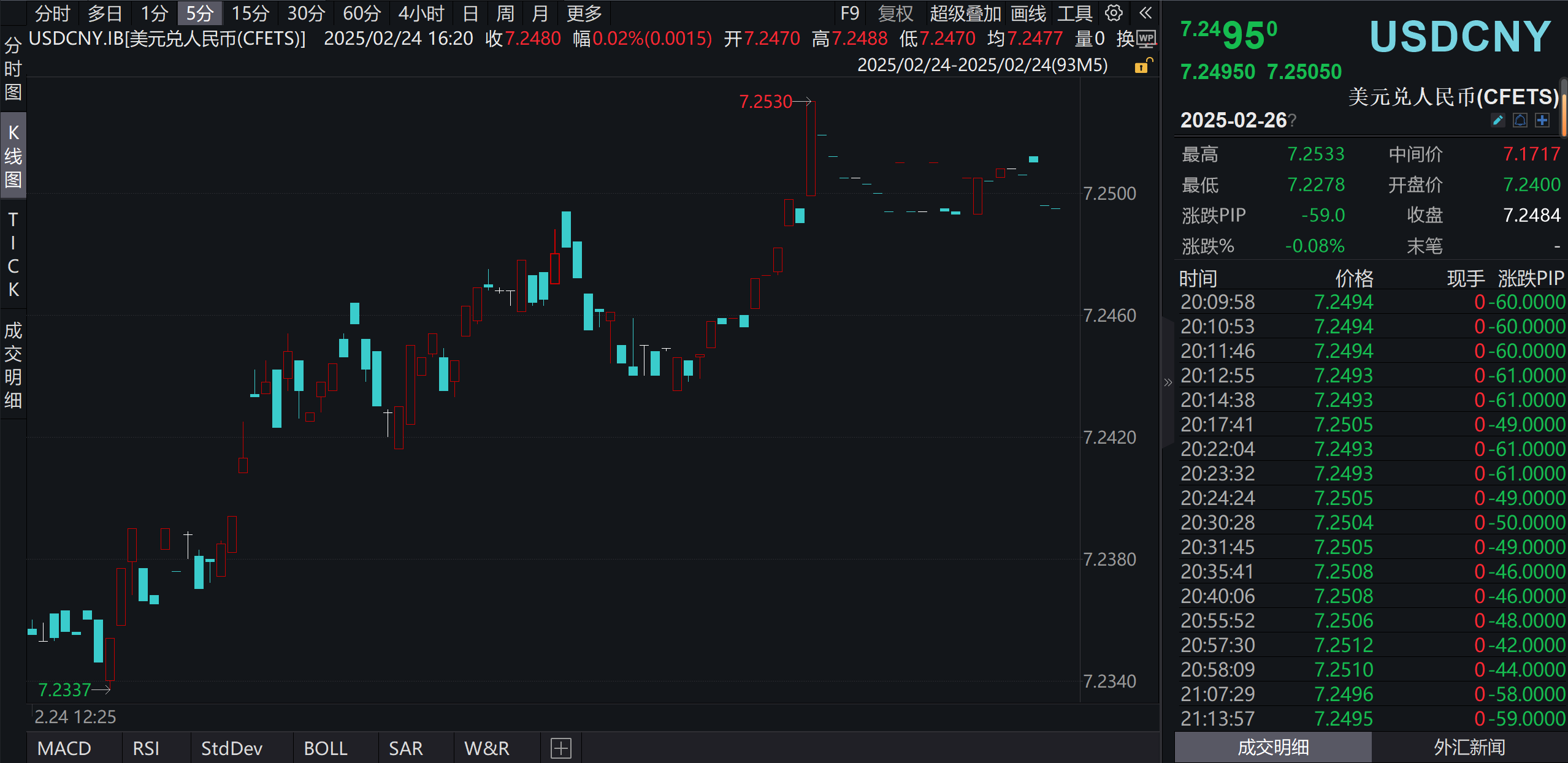 截至2月24日19时,境内在岸市场美元兑人民币汇率(CNY)与境外离岸市场美元兑人民币汇率(CNH)分别徘徊在7.2502与7.2498附近,盘中触及日内新高。这意味着人民币汇率已从两周前的7.3一线明显反弹。