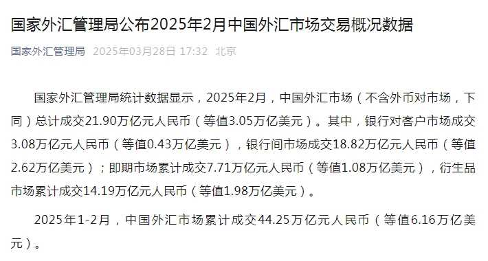 2025年2月,中国外汇市场总计成交21.90万亿元人民币,其中银行对客户市场和银行间市场成交分别达3.08万亿元和18.82万亿元人民币。1-2月累计成交44.25万亿元人民币,显示市场活跃度。