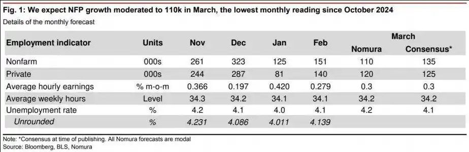 野村预计,3月非农就业人数增长可能从15.1万放缓至11万,失业率可能上升至4.2%。