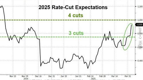特朗普关税措施宣布后,交易员押注美联储最早6月降息。美国短期利率期货上涨,反映出美联储今年降息四次可能性近50%。