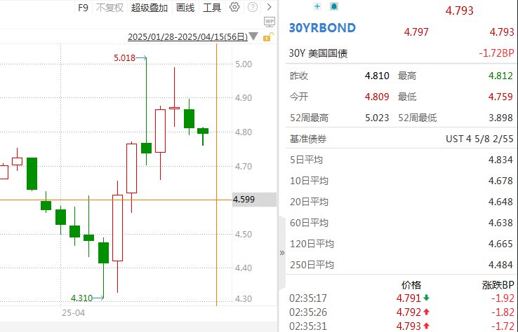 4月7日至4月11日,长端美债价格连续下跌。特别是10年期美债,其收益率从4月4日的3.858%持续上升至4月11日的4.588%。同样,30年期美债收益率也从4.31%攀升至5%以上。但随后,随着美股和美元指数的企稳,美债市场也迎来了反弹,10年期和30年期美债收益率在4月14日均显著下行。