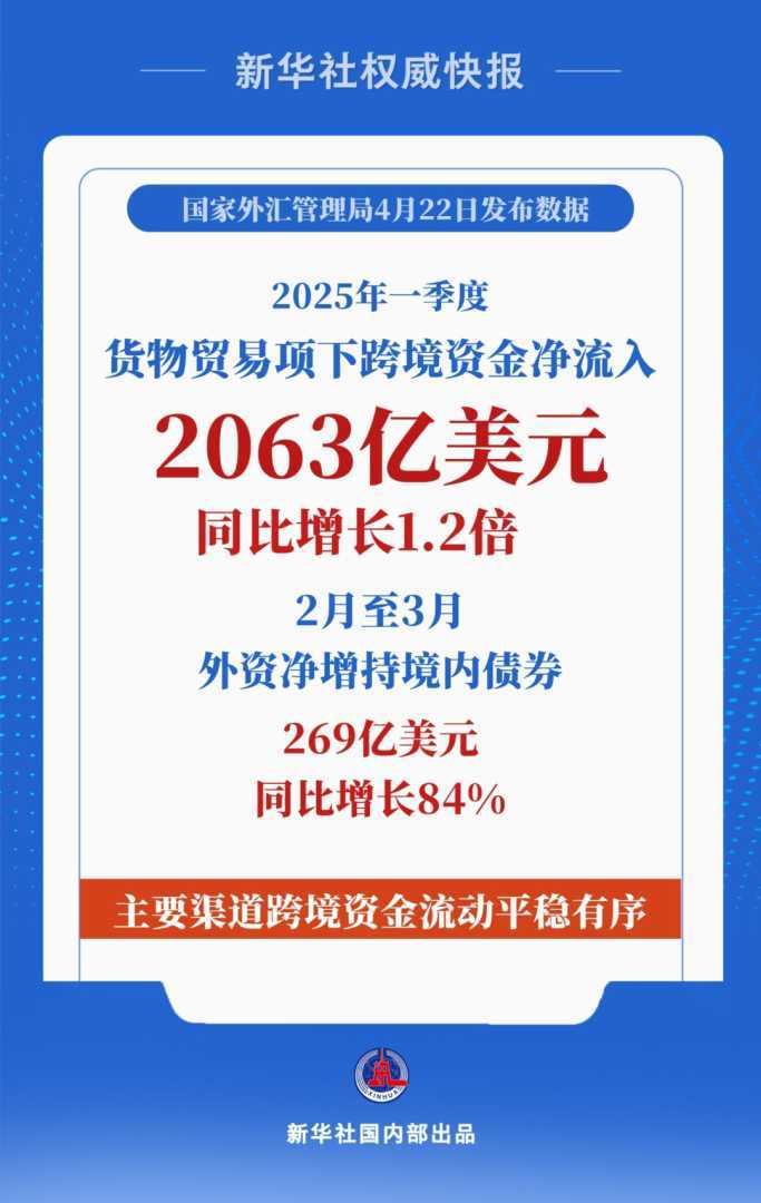 2025年一季度,我国非银行部门跨境资金净流入517亿美元,货物贸易项下资金净流入同比增长1.2倍,外资净增持境内债券同比增长84%,主要渠道跨境资金流动平稳有序,整体呈现净流入态势。