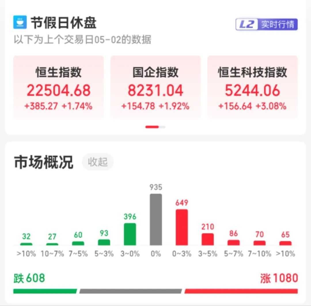 5月2日,A股休市,港股强势上涨,恒生指数收涨1.74%,恒生科技指数收涨3.08%。