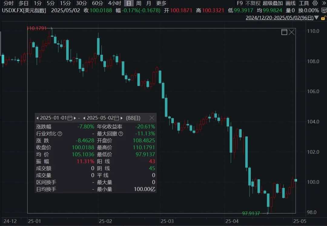近期,特朗普政府贸易政策引发金融市场震荡,导致投资者对美元避险地位产生疑虑,共同促成美元走弱和资金流出。4月份,美元指数表现最差,一度跌破98关口,年初至今累计跌幅达7.8%。