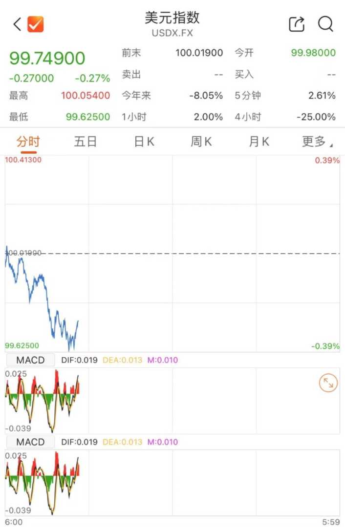 同时,美元指数大幅下挫,盘中跌破100大关,现报99.749,进一步助推人民币汇率上升。