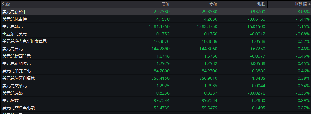 此外,新台币也大幅升值。美元兑新台币盘初跌破30大关,报29.50,日内跌幅达3.95%,创下新高。加上5月4日的跌幅,两天内新台币累计升值超过8%,亚洲货币普遍走强。