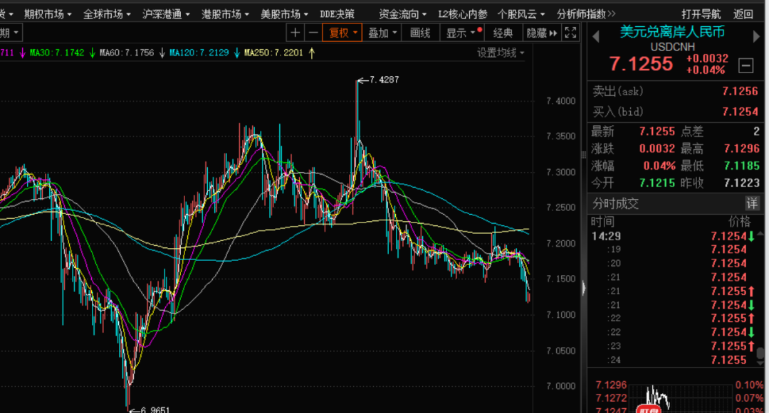 随着中国股市的走强,人民币的确也时常会相伴而行。去年9月底,美元兑离岸人民币一度跌破7,人民币升至6.965附近。那么,此次是否会再度破7?这一关键点位备受市场关注。