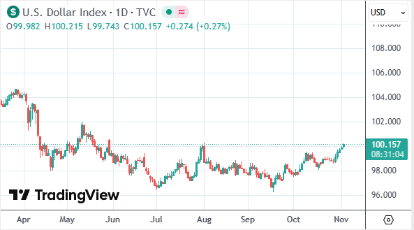 周二(11月4日)欧洲时段,美元指数自8月初以来首度升破100关口,最高报100.21,为三个月来的最高水平。外汇市场波动加剧。分析认为,美元走高的主要原因是联储内部出现分歧,促使交易员下调了对该行降息的预期;与此同时,英国财政大臣暗示下月预算案将面临“艰难抉择”,英镑应声下挫。