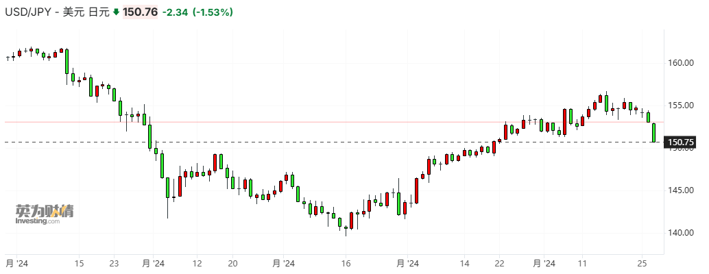 日内,美元兑日元汇率持续走低,先后跌破153、152和151的重要关口,最低触及150.45,创下自10月22日以来的新低。截至最新数据,该货币对报价为150.57,较此前水平下跌超过250点,跌幅达到1.6%。