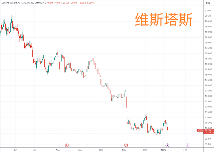 风电板块成为首当其冲的受害者。特朗普明确表示,将制定政策停止新建风电场。这一消息导致丹麦的维斯塔斯股价周三下跌超过5%,沃旭能源跌幅接近6%,创下近一年新低,德国诺德克斯的跌幅也超过5%。自特朗普胜选迹象显现以来,这类股票已显著下跌,维斯塔斯股价自大选后累计下跌超两成,若从“宾州刺杀案”算起,股价更是减半。