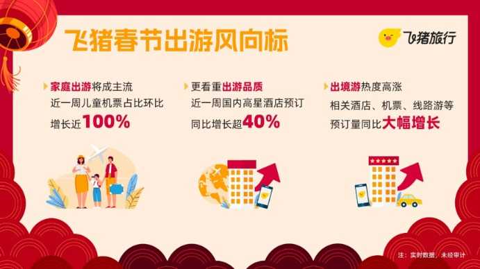 家庭结伴出行将成为今年春节的主流。飞猪预测,今年春节家庭出游人群占比将进一步攀升。数据显示,近一周内,飞猪上国内高星酒店的预订量同比增长超40%。