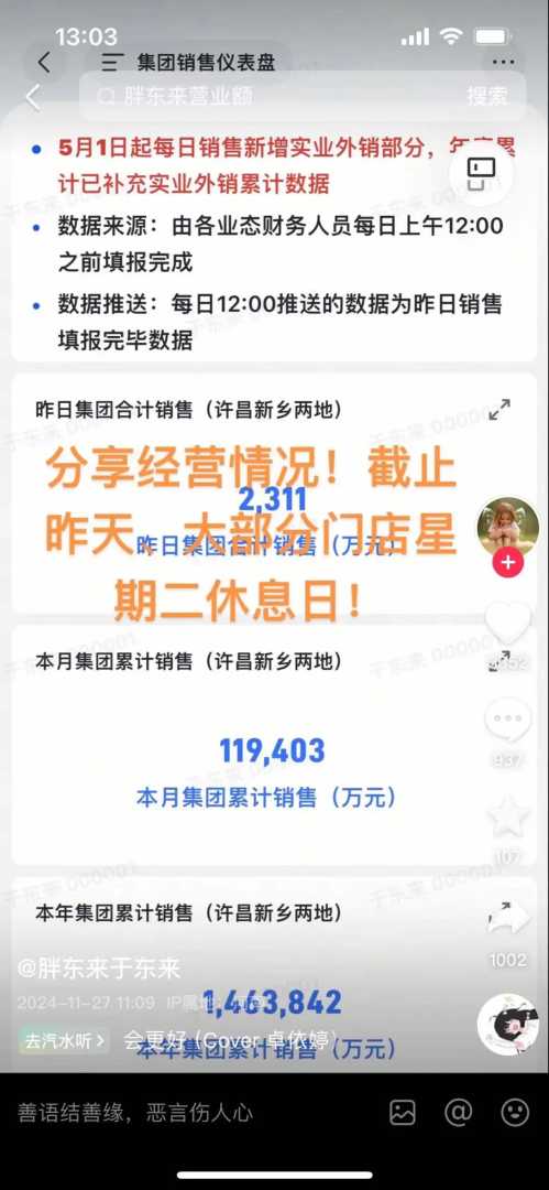 数据显示,截至11月26日,本年度胖东来集团累计销售(许昌新乡两地)已达146.38亿元,日均营业额达5172万元。胖东来的火爆程度可见一斑。