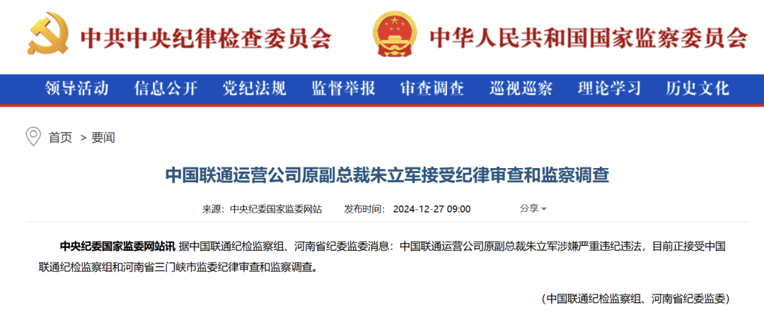 近日,反腐行动再掀高潮。中央纪委国家监委官网于12月27日发布通报,指出中国联通运营公司原副总裁朱立军因涉嫌严重违纪违法,正接受中国联通纪检监察组和河南省三门峡市监委的纪律审查和监察调查。