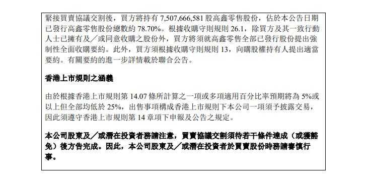1月1日,阿里巴巴集团正式对外宣布,其子公司及New Retail已与德弘资本达成了一项重要协议,协议内容关于出售所持有的高鑫零售全部股权,共计约占高鑫零售已发行股份总数的78.7%。根据双方签署的协议条款,阿里巴巴子公司及New Retail将有权收取待售股份的最高金额,该金额高达约131.38亿港元,折合成每股价格为1.75港元。