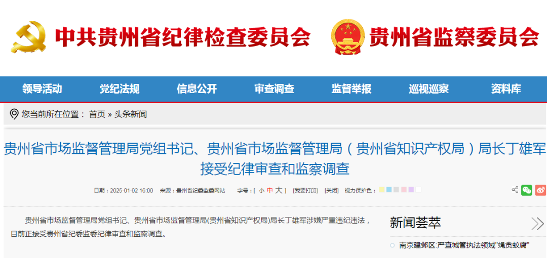 2025年1月2日,中央纪委国家监委网站发布官方消息,贵州省纪委监委通报称,贵州省市场监督管理局党组书记、局长(兼贵州省知识产权局局长)丁雄军因涉嫌严重违纪违法,正在接受贵州省纪委监委的纪律审查和监察调查。