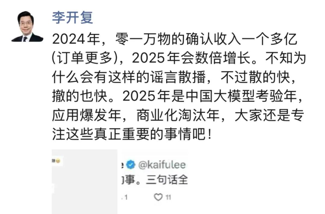 在正式辟谣之前,零一万物创始人李开复已在朋友圈发文回应。他强调,2024年零一万物已确认收入一个多亿元,且订单更多。他相信谣言会很快散去。同时,李开复还指出,2025年将是中国大模型考验年、应用爆发年、商业化淘汰年。