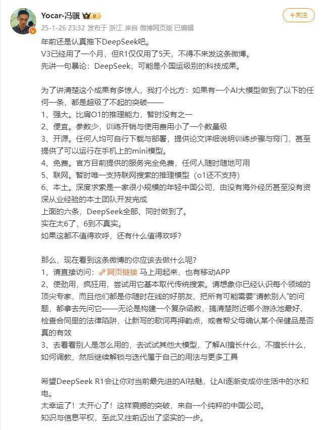 1月26日深夜,冯骥通过微博发文,盛赞DeepSeek为顶级科技成果。他表示,这一震撼性的技术突破来自一个纯粹的中国公司,标志着知识与信息平权又向前迈出了坚实的一步。冯骥还表达了对DeepSeek R1的期待,认为它能让AI逐渐融入人们的日常生活,变得如同水和电一样不可或缺。