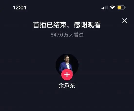 尽管如此,直播仍吸引了大量观众,截至中午12点左右余承东自驾到达终点一门店准备结束直播时,其抖音直播间观看人数已突破847万。然而,就在此时,余承东的抖音直播间突然被封禁,直播戛然而止。