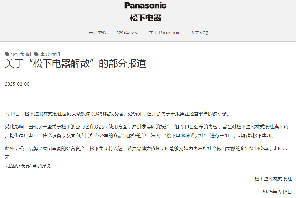 针对上述传闻,松下电器官方迅速作出澄清,明确表示2月4日所公布的内容,其核心目的在于对松下控股株式会社旗下的单一法人实体——松下电器株式会社(主要负责提供家用电器、住宅设备以及面向店铺和办公室的商品与服务)进行战略重组,而非外界所误解的松下集团整体解散。