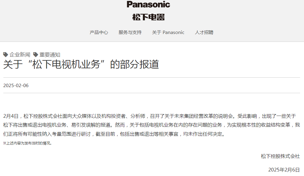 2月6日,南财快讯·辟谣旋风队特别报道,松下控股株式会社在2月4日面向广泛的受众,包括大众媒体、机构投资者及专业分析师,成功举办了一场关于集团未来经营改革的重要说明会。这一活动迅速引发了市场的广泛关注,并有部分媒体据此报道称,松下正计划实施重大改革,或将解散历史悠久的松下电器公司,并考虑彻底放弃电视业务。