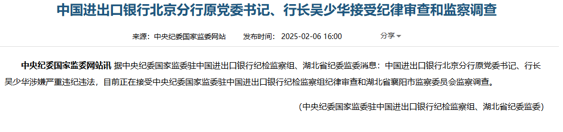 财中社2025年2月7日电 根据最新消息,中央纪委国家监委驻中国进出口银行纪检监察组与湖北省纪委监委联合发布通报:中国进出口银行北京分行前任党委书记、行长吴少华因涉嫌严重违纪违法行为,目前正面临中央纪委国家监委驻中国进出口银行纪检监察组的纪律审查以及湖北省襄阳市监察委员会的监察调查。这一事件再次引发公众对中国进出口银行内部管理的关注。