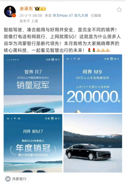 2月11日,华为常务董事、终端BG董事长、智能汽车解决方案BU董事长余承东在微博表示:智能驾驶,凑合能用与好用并安全,是完全不同的境界!就像打电话有网就行,上网就需5G!这就是为什么很多人说华为鸿蒙智行是断代领先!本月他将为大家揭晓尊界的核心黑科技,一起看见智慧出行的未来!