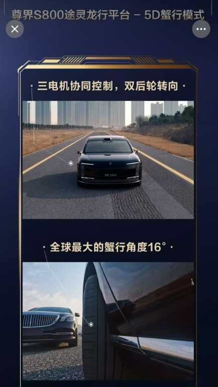 余承东表示,尊界S800远远超越了迈巴赫、劳斯莱斯Phantom这个档次,定位更豪华、更高端、更舒享。江淮定位是超高端,享界定位高端轿车,智界定位广泛中档和中高端,问界主要重点聚焦在SUV。值得注意的是,天眼查显示,近日,深圳引望智能技术有限公司申请注册“5D蟹行”“华尔兹掉头”商标。5D蟹行已在尊界S800上应用。视频中,尊界S800利用后轮转向、三电机协同控制,在两列车辆间灵活穿行,实现横移场景下的目标最优控制。得益于该平台强大的多维协同能力,尊界S800可实现行业最大蟹行角度——16°,可以在窄路、窄车位等极限场景灵活穿行。