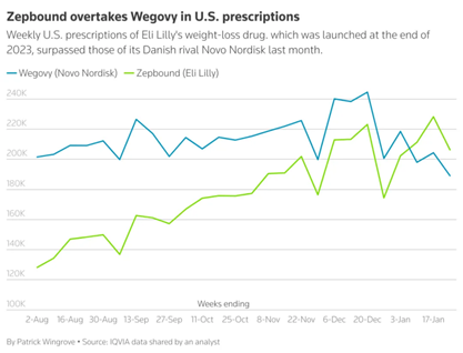 根据IQVIA数据,2024年的最后3个月内,在美国这个最大的市场,Wegovy每周处方总量已经输给礼来的减肥药Zepbound。