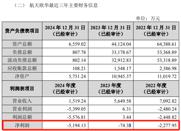 财务数据显示,航天欧华2022年、2023年、2024年净利润分别为-2277.95万元、-74.35万元、-5194.13万元。