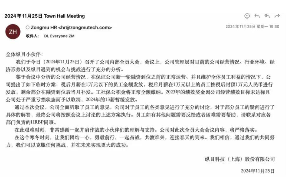 事实上,纵目科技今日的局面,此前便已显露苗头。据内部员工透露,每月10日是工资发放日,在去年11月10日,公司忽然宣称发薪日延期至25日。到了11月25日当天,公司再次发布通知,“无法发放全薪,公司将为员工正常缴纳社保公积金,但税后月薪按封顶1万元发放,且2023年绩效奖金取消。”随后,这样的“欠薪模式”便一直持续进行。至今年1月26日时,纵目科技召开全体员工会议,宣布不再发放工资和缴纳社保“停摆”。