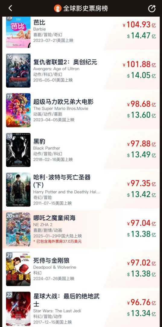 《哪吒2》“捅破”中国影史票房天花板后,正一步一个脚印,刷新更多全球票房纪录。