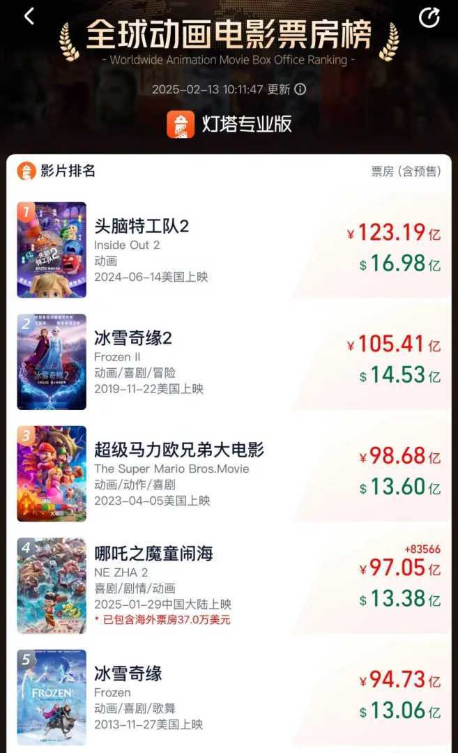目前,猫眼专业版上《哪吒2》的预测票房已经超过160亿元,有望登顶全球动画电影票房榜。目前其最新票房已经超越《冰雪奇缘》,位列全球动画电影票房榜第4名。
