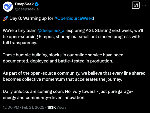 DeepSeek宣布下周起陆续开源5个代码库,每日解锁新内容。当前在线服务模块已测试完备,可投入生产。公司坚信分享将加速行业发展,强调车库创业精神与社区创新力量。