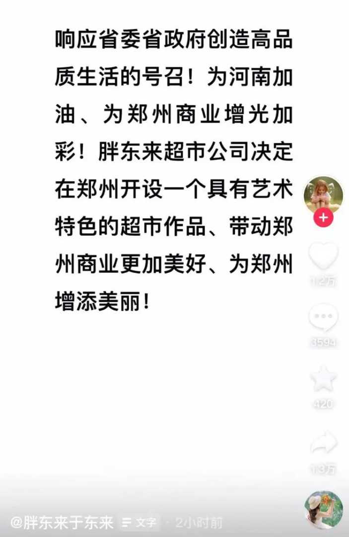 于东来在社交媒体上发文表示,“胖东来超市公司决定在郑州开设一家具有艺术特色的超市,以带动郑州商业的繁荣发展,为郑州增添新的美丽!”