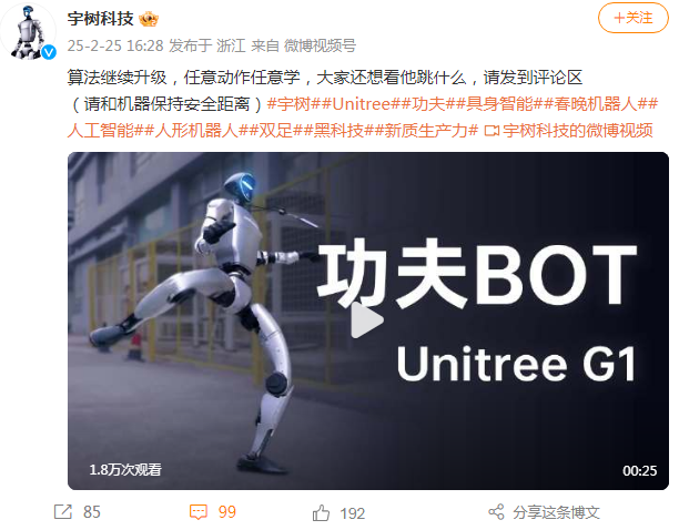 2月25日,宇树科技官方微博发布了一段会功夫的机器人视频。据宇树科技介绍,随着算法能力的提升,机器人已能学习并执行任意动作。视频中,该机器人展现了挥拳、旋踢等高难度武术动作,动作流畅自然。