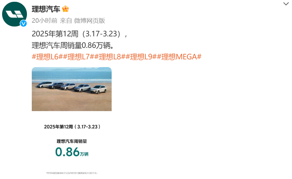 理想汽车此次单独公布销量,或是对中汽协倡议的积极响应。数据显示,2025年3月17日至3月23日,理想汽车周销量达到0.86万辆。