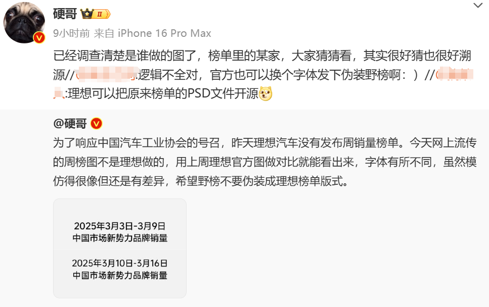 此前,中汽协曾发布倡议书,呼吁车企停止发布销量周榜,以避免碎片化信息引发片面解读,减少误导性舆情对市场的干扰。理想汽车高管“硬哥”也在微博发文表示,理想汽车积极响应中汽协号召,3月18日并未发布周销量榜单,网传周榜图并非理想汽车所做。